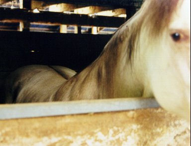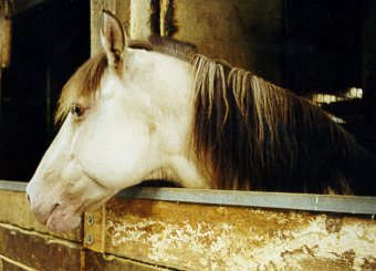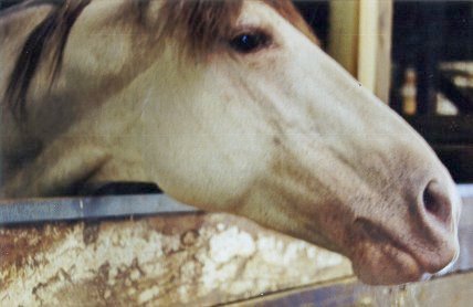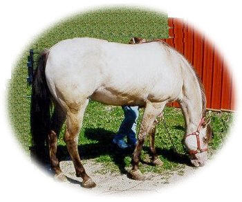 Nikki lives in a suburb of Cincinnati, Ohio.  She is believed to be a grade QH mare. Her owner is Ruth Lewis, who also lives in the area.  She was going to provide us with new photos, and was planning to try to find out more about Nikki's past, but last I heard she hadn't, and I've los touch with her.  So far, all she knows is that she had a Palomino brother.  Perhaps he's a Gold champagne...