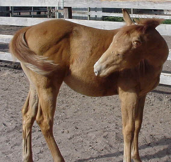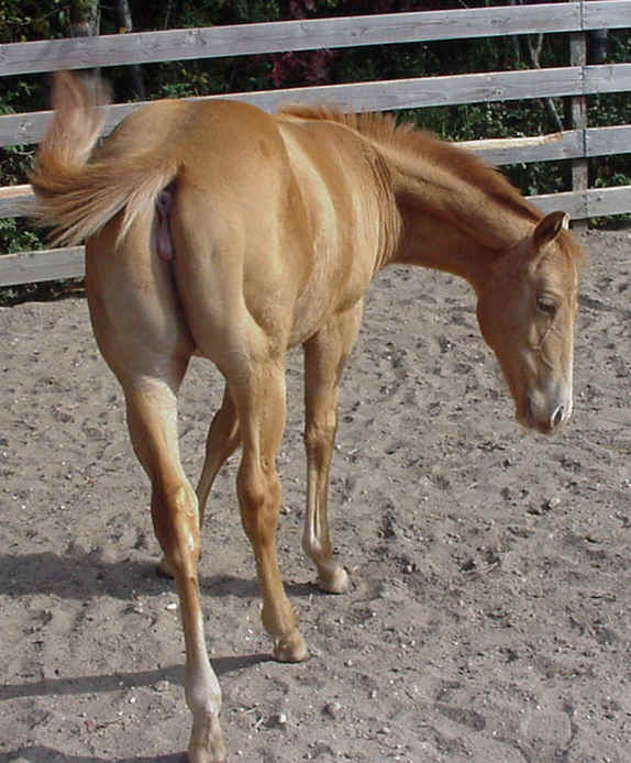 This filly, Zips SiouxzQ Outlaw, is an example how most gold champagnes start out the same beautiful golden-sorrel color all over.   Note the mane & tail are the same color as her body. This gold champagne foal belongs to Rita Gambino of Long Island, New York.  (Note: she's all grown up now, with a flaxen mane & tail, and taking her mama's place as Rita's Champagne brood mare!)