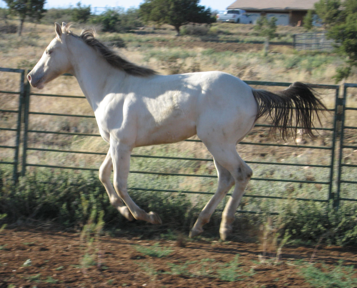 Born 3/27/08 in Arizona, this beautiful Classic Cream Dun (Smoky Grullo Champagne) is a yearling stud colt. DNA results show he is black based, cream and champagne and has tested HERDA N/N.  He is about 14.2 hands now. We believe he will mature close to 15.3!