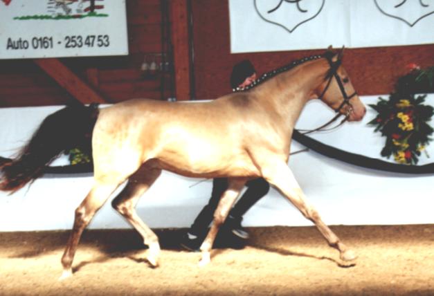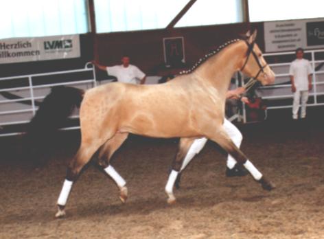Gwendolyn Gregorio, Khalvins' owner, reports: "Khalvin Khlein KpM, the imported US APb (Arabian Partbred) stallion was approved with the German Arabian Breed Association ZSAA on 11th/12th of May 2001.  He scored a sensational 8 for type and trot! Comment of the breeding director for his performance: jumps with great elastic bascule and very good technique, outstanding trot with great elasticity and very good balance, beautiful type and great stallion presence." The 4 photos to the left were taken by Bildreport Wagner during his test for this approval.