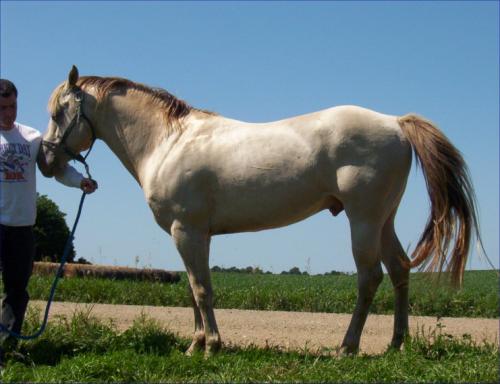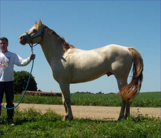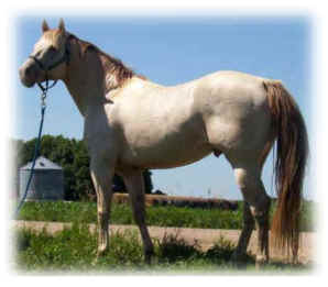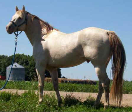 "Ivory" has the distinction of siring the first known roan champagne (from a roan dam) and the first sable cream champagne registered in the ICHR. He has both a cream and a champagne gene, so will produce 75% dilute foals. His bloodlines go to Skipper W, and he is muscling out nicely as he matures. He is well balanced and has no light side. This horse is very easy to work with, and all of his foals share that trait.
